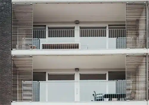 Excellent for creating, sheltered, usable spaces inset balconies are often the most effective method for ensuring private balconies meet comfort criteria. By combining screens such as that shown in the image below with an inset balcony a space is created that is versatile and protected all year round.