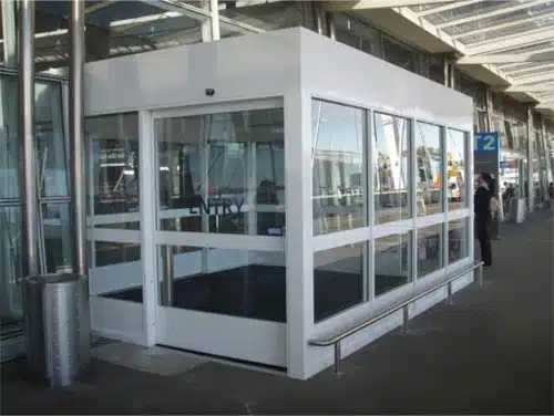 This treatment is very effective for situations where there is a venturi effect between two tall buildings or a street canyon effect. This idea can also be used to design an airlock for the main entrance to a building.