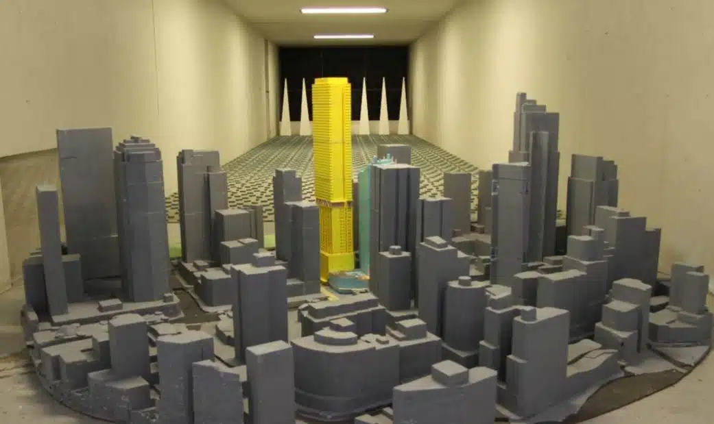 Figure 1. The Model of the Greenland Centre (yellow) being tested in one of Windtech’s wind tunnel facilities in Sydney.