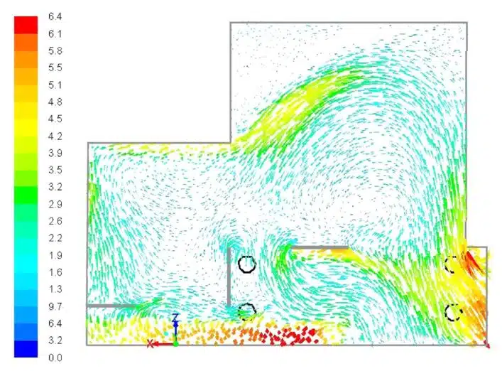 • Modelling of the dispersion of smoke from the BBQ in the balconies, including assessment of the best location within the proposed Sydney Balconies for ventilating the smoke from the BBQ. The results (see below) show that the proposed Sydney Balcony design to be quite effective in dispersing the smoke without it recirculating within the balcony.