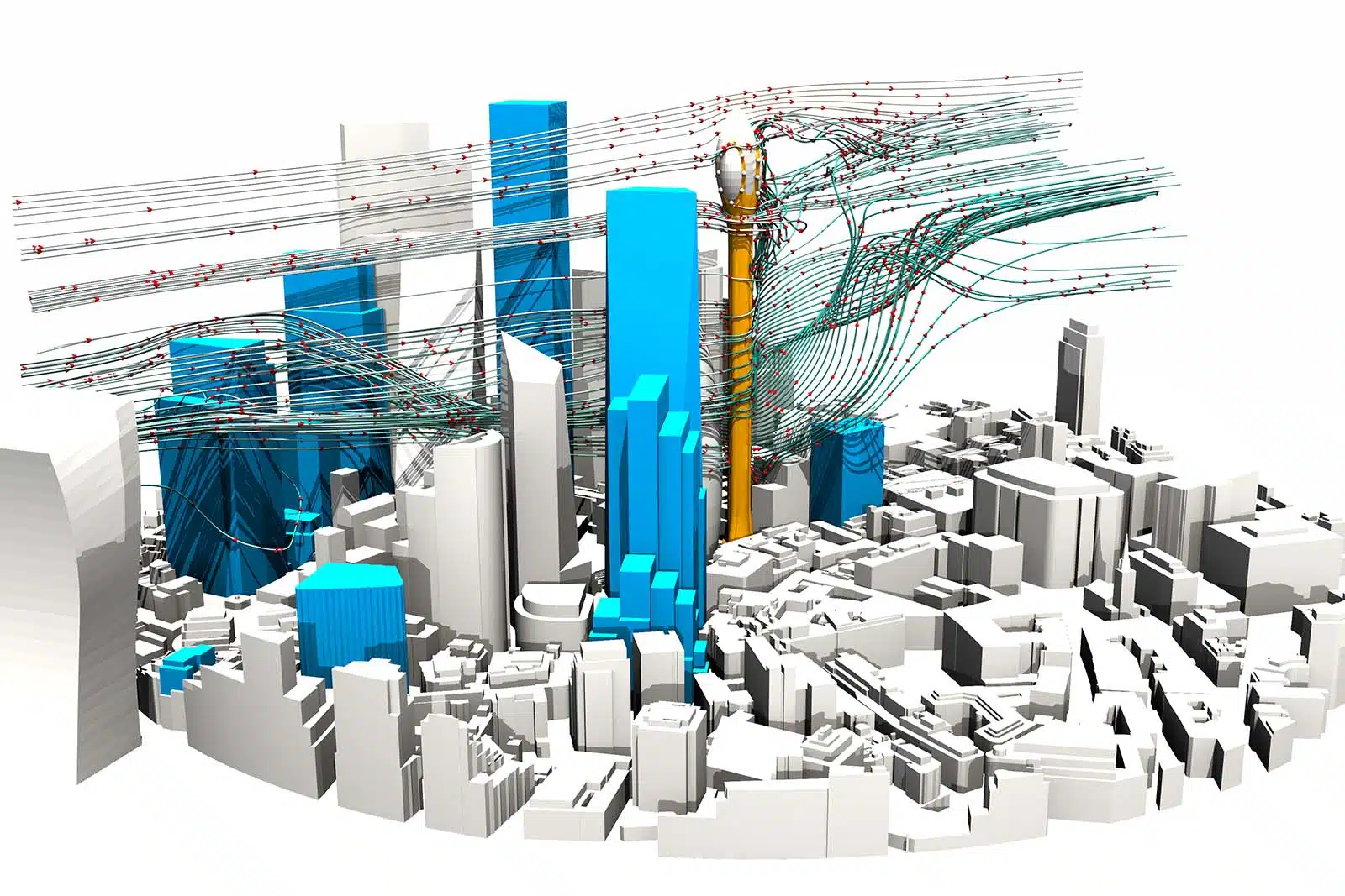 The Tulip, London – Wind Flow Streamlines showing the westerly wind impacting the building through the City of London (CoL) central cluster.