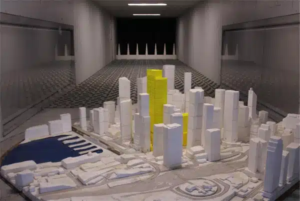 Prior to wind tunnel testing, a detailed wind tunnel model was carefully replicated at 1:300 scale using the latest 3D printing technology to ensure accurate modelling of the small gaps between the wall cladding and to properly model the flow regime around the curved façade.