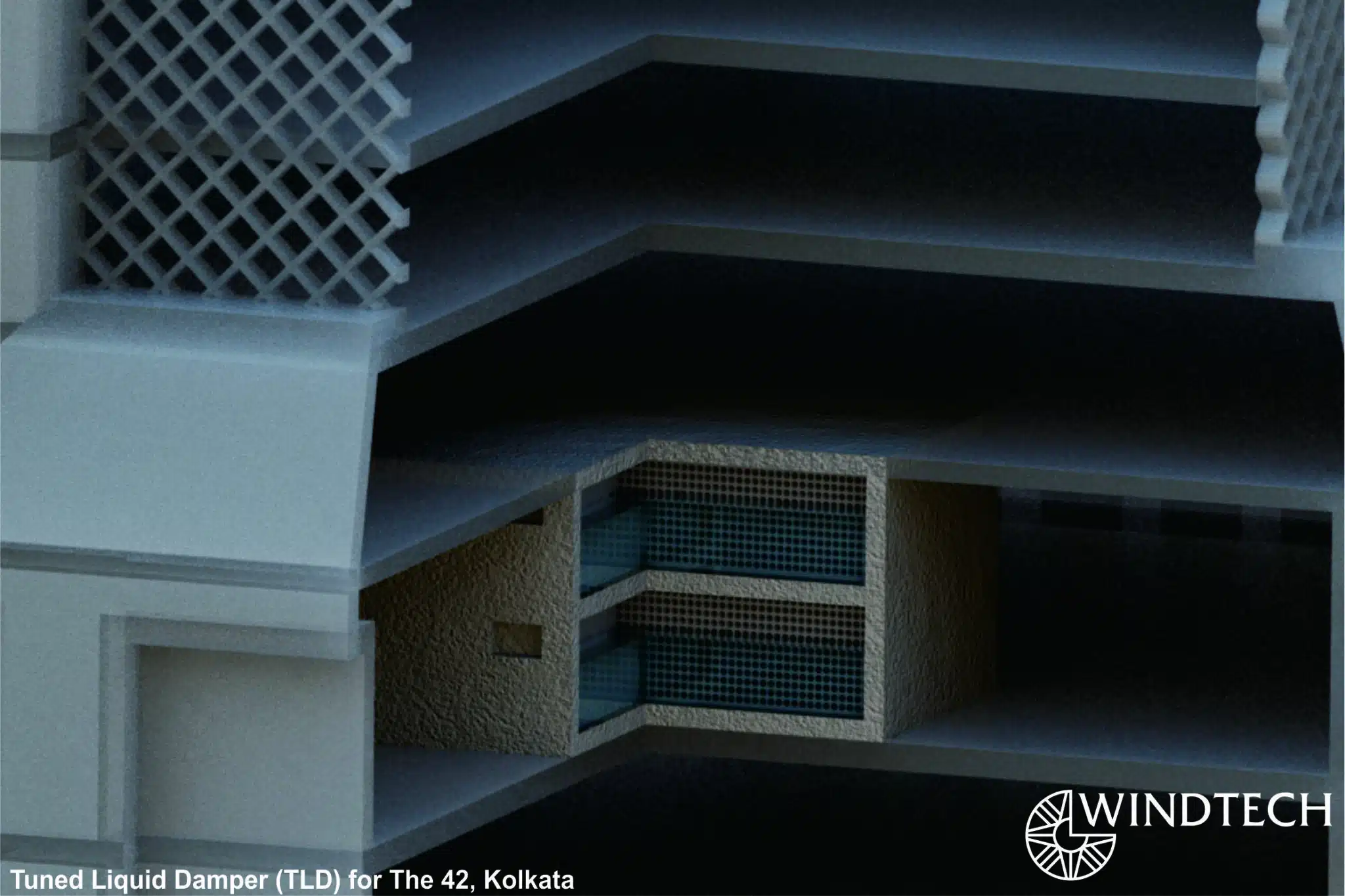 Due to the height, extremely slender form and the architectural constraints dictating the structural design, it was found that under serviceability wind conditions, the tower’s movement was predicted to be uncomfortable for its occupants. As this issue was identified at the design stage using accurate wind tunnel testing, it created an opportunity to investigate a range of possible solutions to mitigate this effect. Solutions such as building corner modification, removal of floor cluster, building tapering to confuse synchronous loads from increasing the magnitude of oscillation and/or significant modifications to the structural system were not well suited to this project. The solution chosen was to install an auxiliary damper. Building motion dampers work in much the same way as the shock absorbers on a car – however, instead of absorbing of impact of a pothole for the comfort of those driving the car, the building damper reduces the impact of wind vortices thereby improving the comfort of tenants in the building. Windtech designed and tested a prototype of the tuned liquid damper (TLD), then provided a detailed design, tuning and commissioning the liquid damper installation.