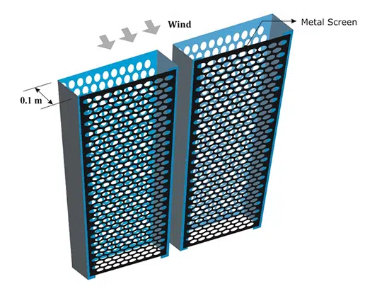 The expanded metal screens were most effective in completely eliminating the harmonics between the vortices shed behind the original screens. The punched metal screens with a randomised pattern was also effective for most of the cases and generated a low amplitude noise for one angle of attack in high wind.