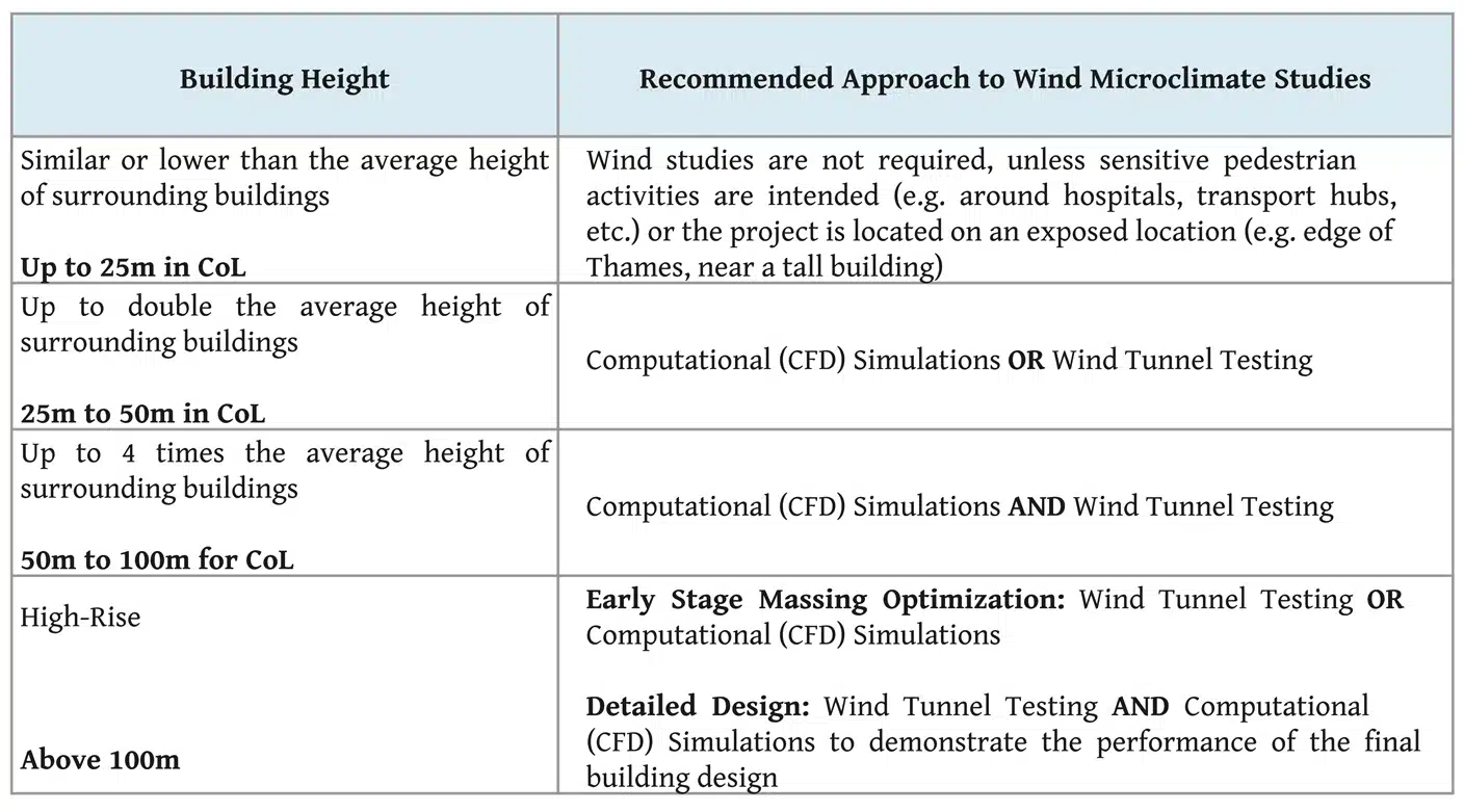 Ms Yiqing Wang, a senior engineer at Windtech Consultants’ London office says: “Putting the comfort and safety of cyclists and pedestrians first, the City of London Corporation published the UK’s first wind microclimate guidelines that are expected to create a blueprint for others by delivering safer, more enjoyable streets that meet the evolving needs of the City. The City of London Wind Microclimate Guidelines has stringent requirements especially for tall buildings that are above 100m in height. Where both wind tunnel and CFD (Computational Fluid Dynamics) are required, the two wind modelling approaches must be carried out by independent consultants.” The new requirements are outlined in the table below.